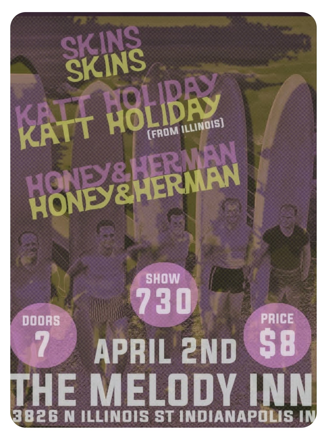 September 12, 2015 MelMel Comment off Calendar Add to Calendar Add to Timely Calendar Add to Google Add to Outlook Add to Apple Calendar Add to other calendar Export to XML Click to view map When: April 2, 2026 @ 7:00 pm – 11:30 pm 2026-04-02T19:00:00-04:00 2026-04-02T23:30:00-04:00 Where: Melody Inn 3826 N Illinois St Indianapolis, IN 46208 USA Cost: $8 Contact: 317-923-4707 Email Event website