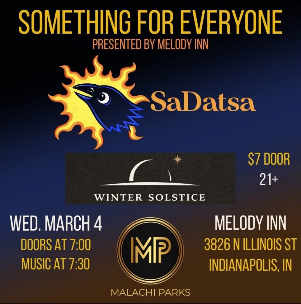 September 12, 2015 MelMel Comment off Calendar Add to Calendar Add to Timely Calendar Add to Google Add to Outlook Add to Apple Calendar Add to other calendar Export to XML Click to view map When: March 4, 2026 @ 7:00 pm – 11:30 pm 2026-03-04T19:00:00-05:00 2026-03-04T23:30:00-05:00 Where: Melody Inn 3826 N Illinois St Indianapolis, IN 46208 USA Cost: $7 Contact: 317-923-4707 Email Event website